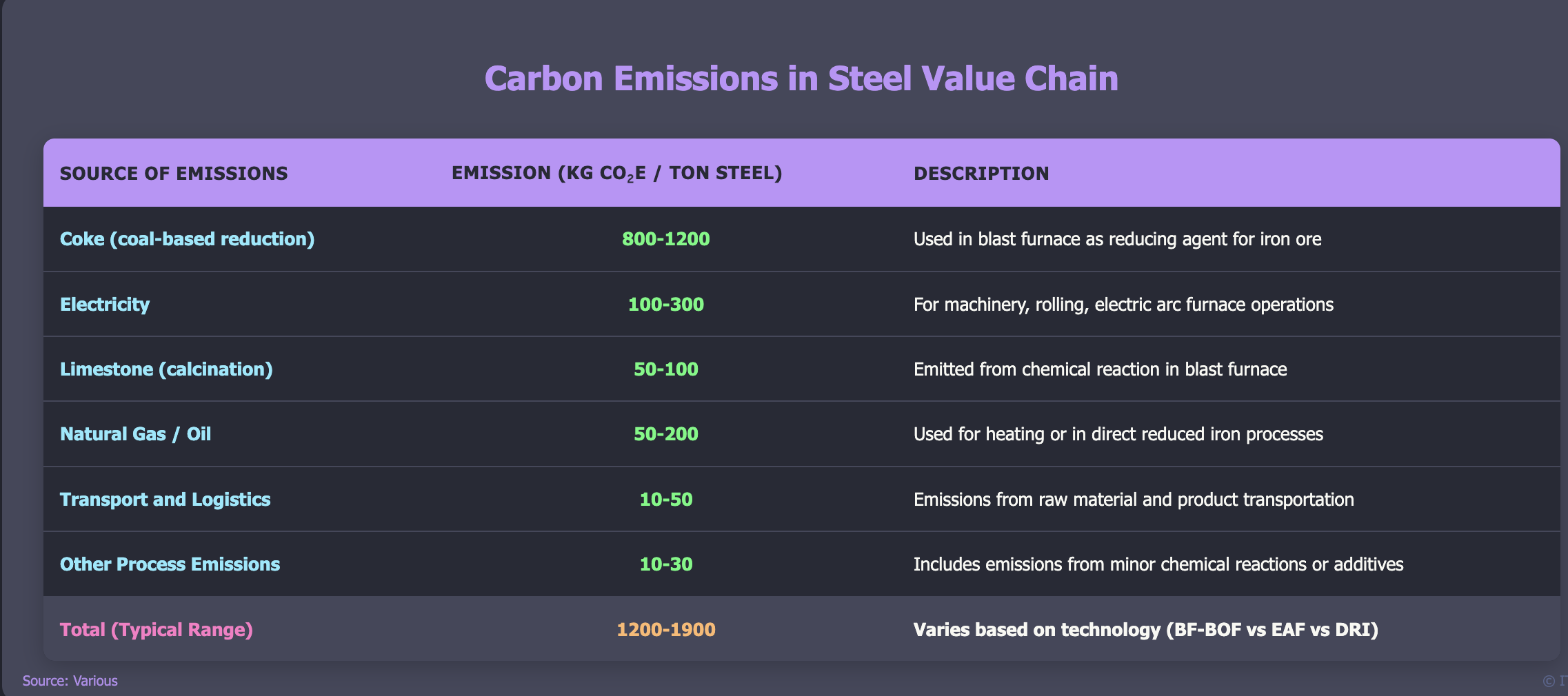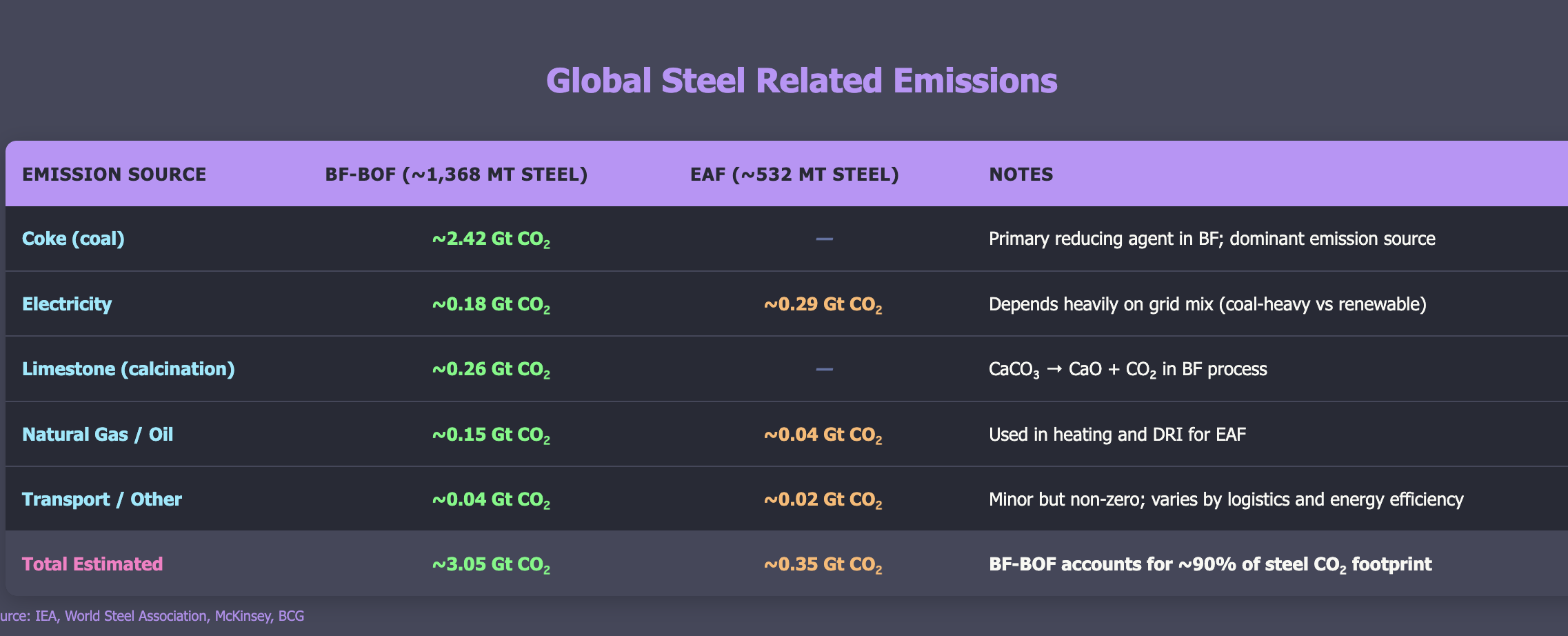 Global steel production generates approximately 3.4 Gt CO₂ annually, representing roughly 9% of global fossil fuel CO₂ emissions. The blast furnace route dominates emissions due to its reliance on coke as both fuel and reducing agent, while electric arc furnace emissions depend heavily on electricity grid composition.