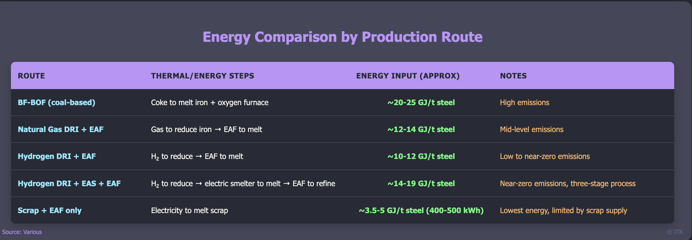 Different steel production pathways demonstrate varying energy requirements and efficiency profiles. The hydrogen DRI plus electric arc furnace route offers energy advantages compared to traditional blast furnace operations while enabling near-zero emissions when coupled with clean energy sources.