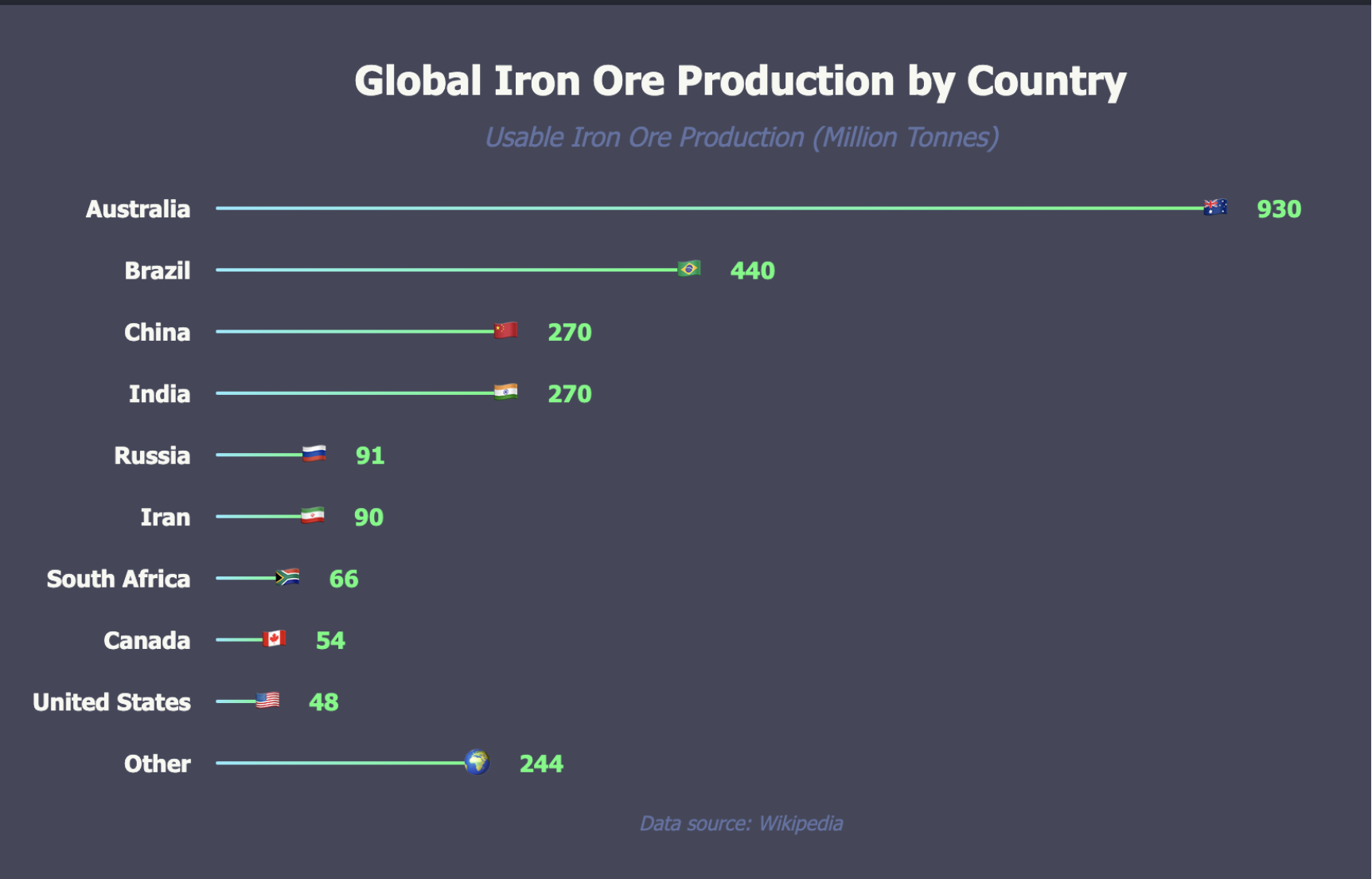 China produces approximately 270 million tonnes annually but relies heavily on imports due to predominantly low-grade domestic ore. India contributes 260 million tonnes with high domestic consumption and restricted exports. Other significant producers include Russia (100 million tonnes), South Africa (70 million tonnes), Ukraine (50 million tonnes), Canada (50 million tonnes), and the United States (40 million tonnes).