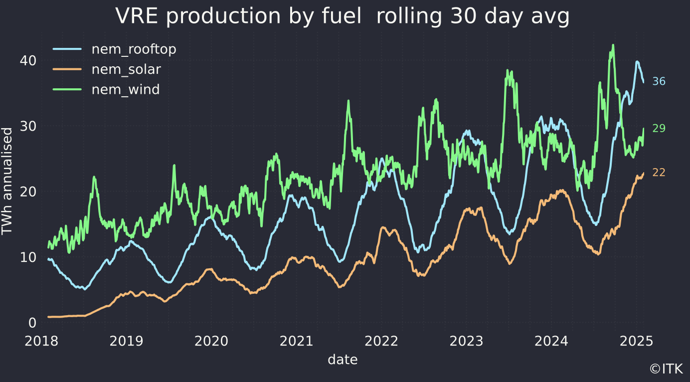 In a figure that will suprise noone the heavy lifting in the growth of VRE production is being done by rooftop solar. That said wind capacity has increased by around 2 GW v last year but hasn’t fully ramped up. At a capacity factor of say 35% 2 GW of wind produces about 3 TWh and rooftop solar produces an incremental 1.5 TWh each year.