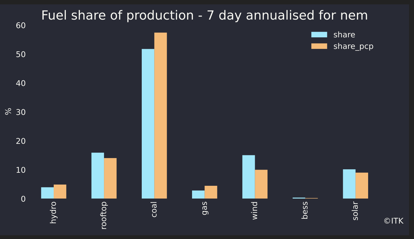 Looking at the shares over the past week, far more influenced by short term weather, the VRE share was 41% and renewables share 45%. The pleasing thing is the growth in wind.