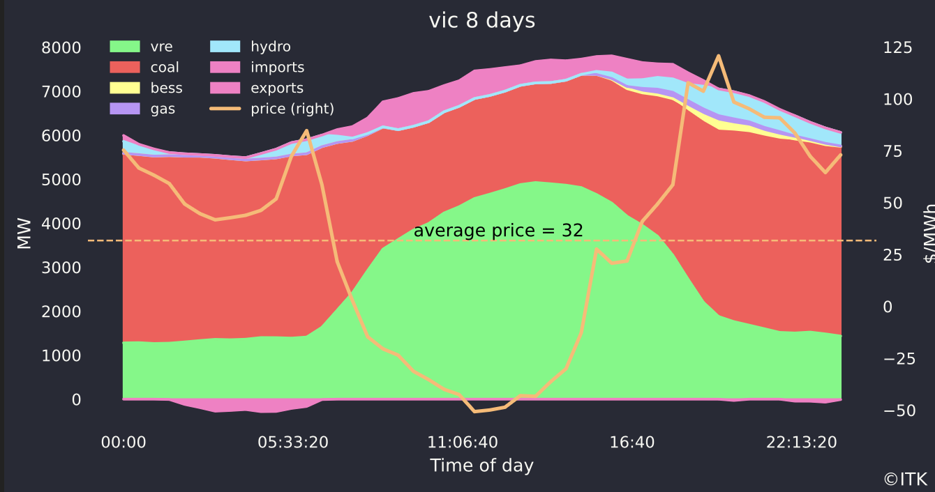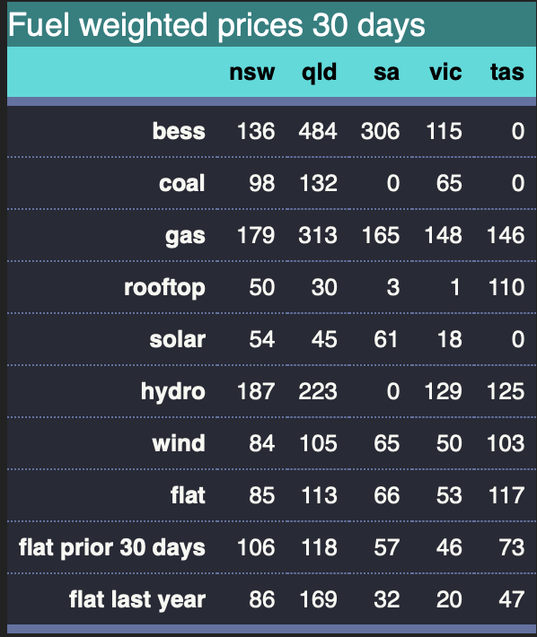 That spike had a much smaller impact in in Victoria (but risks increase when Yallourn closes or if an LYA unit breaks) and the average price is much lower. The figure below shows the 8 day picture for Victoria but if I just looked at yesterday I’d have seen hydro, gas and batteries at much higher outputs during the spike. Batteries in both SA and VIC appear to have captured the price spike but as seen in the table above right now the best place on average to have a battery is QLD.