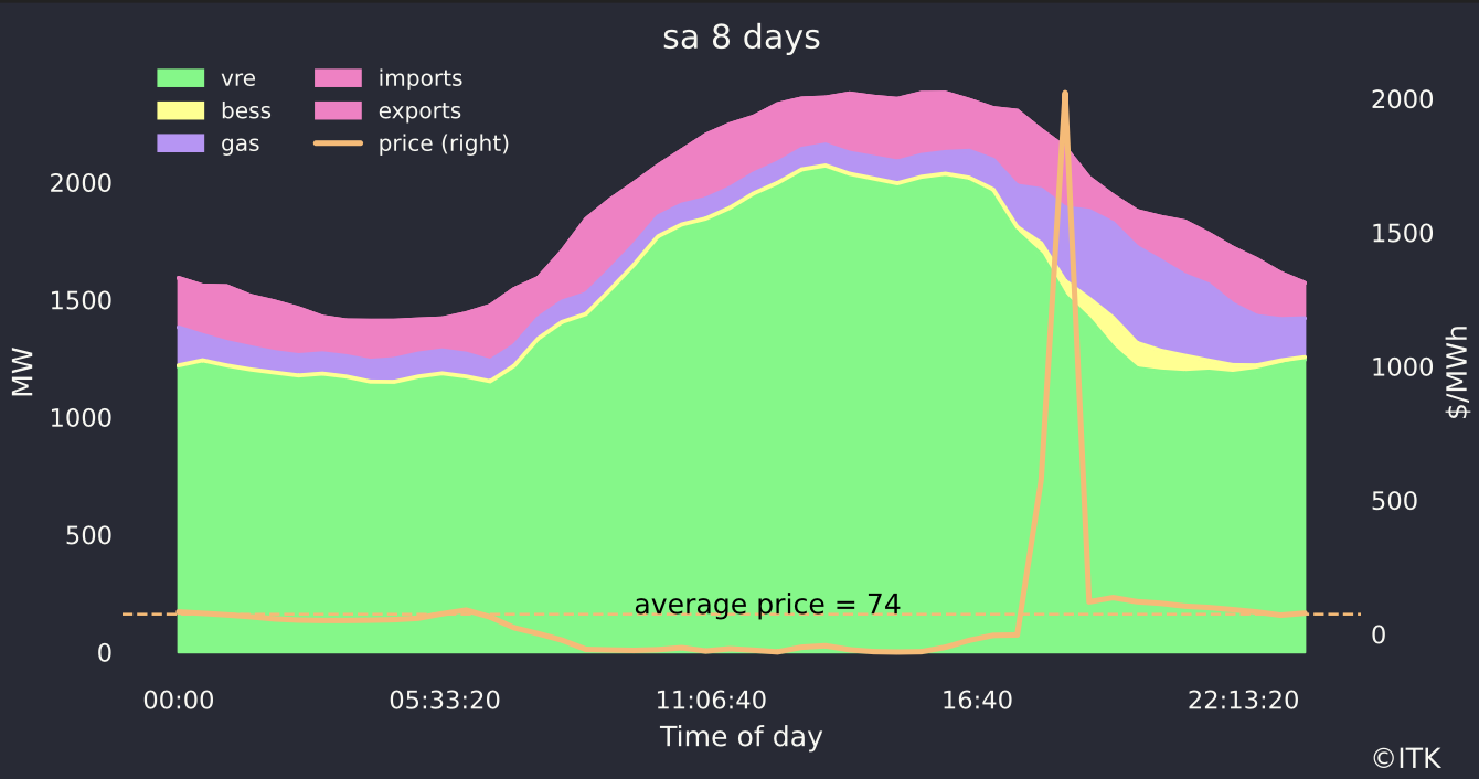 In the following 8 day average chart what shows up is one price spike that pushed prices briefly over $14,000/MWh is enough to move the average price up to $74/MWh even though most prices in South Australia we well below that.