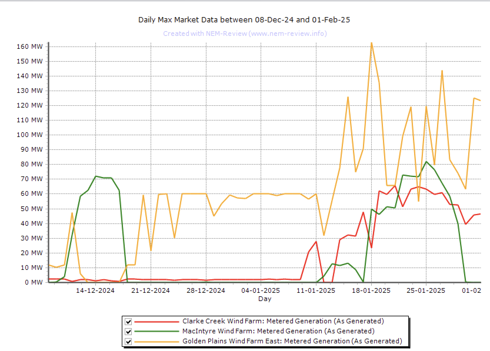 For the roughly two GW of wind ramping up NEM review data shows Golden Plains has now hit maximum output of 160 MW and Clark Creek has hit 60 MW.