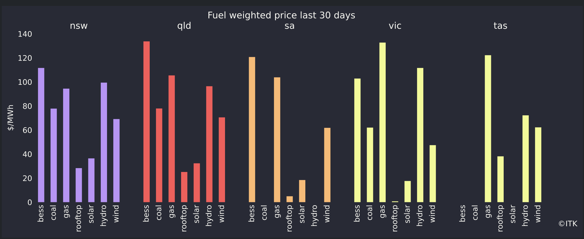 But once built batteries have a low SRMC, close in fact to zero, or at worst in NSW $40/MWh. But so far, the tighter the overall supply demand balance -> the higher the average price -> the more likely batteries will charge more than gas. Or is that because NSW and QLD have less batteries relative to total demand?