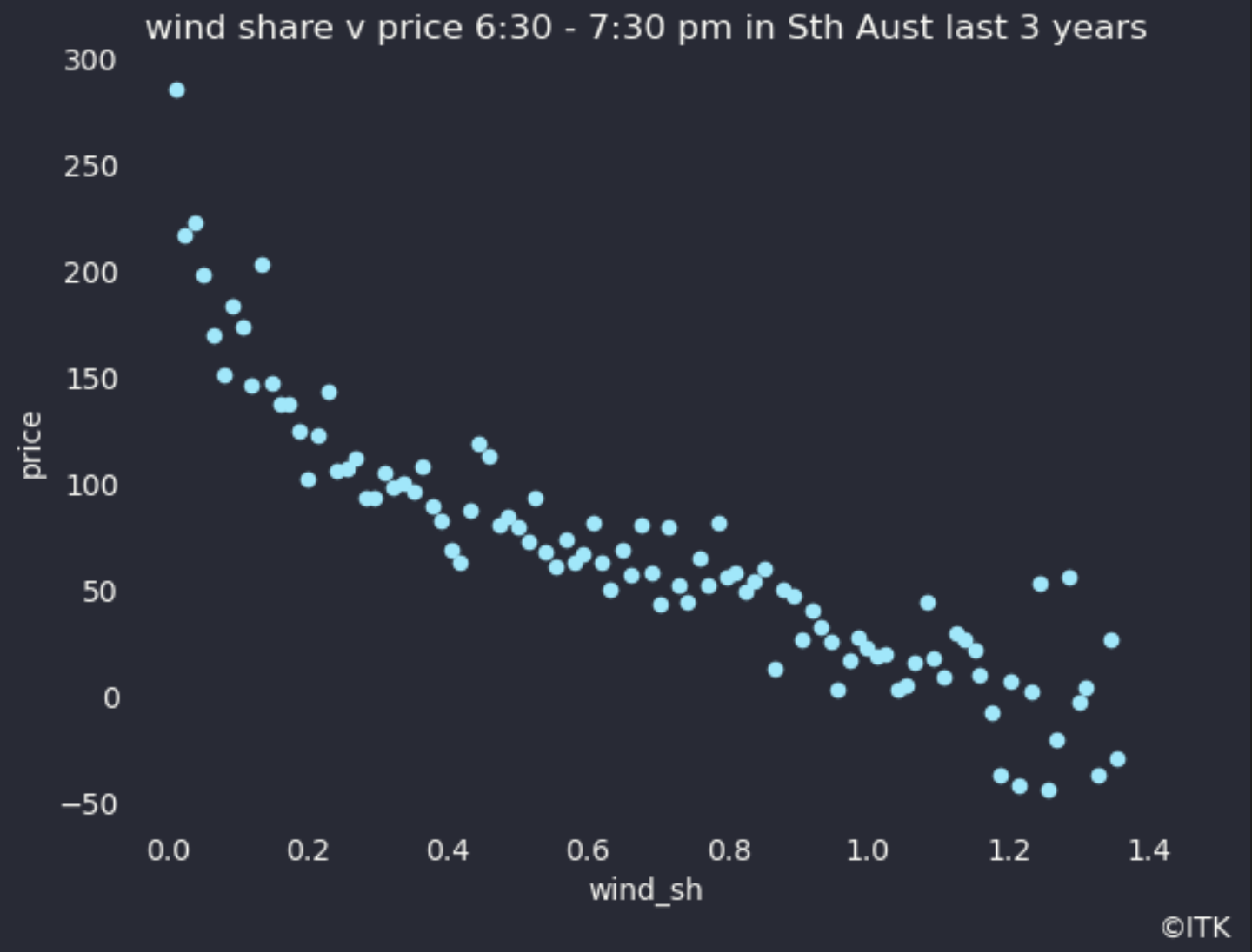Figure 4 was derived by taking taking the wind share in the 6:30 - 8:00 PM window for every day in the past 3 years then making 100 bins of the wind share sorted from highest to lowest and looking at the median price for each bin. It provides a clearer picture, to my way of thinking than a standard correlation graph. Just as you might expect the less the wind blows at dinner time the higher the price tends to be. Other factors can also set the price of course so that even when the wind share is 100% price need not be zero or negative.