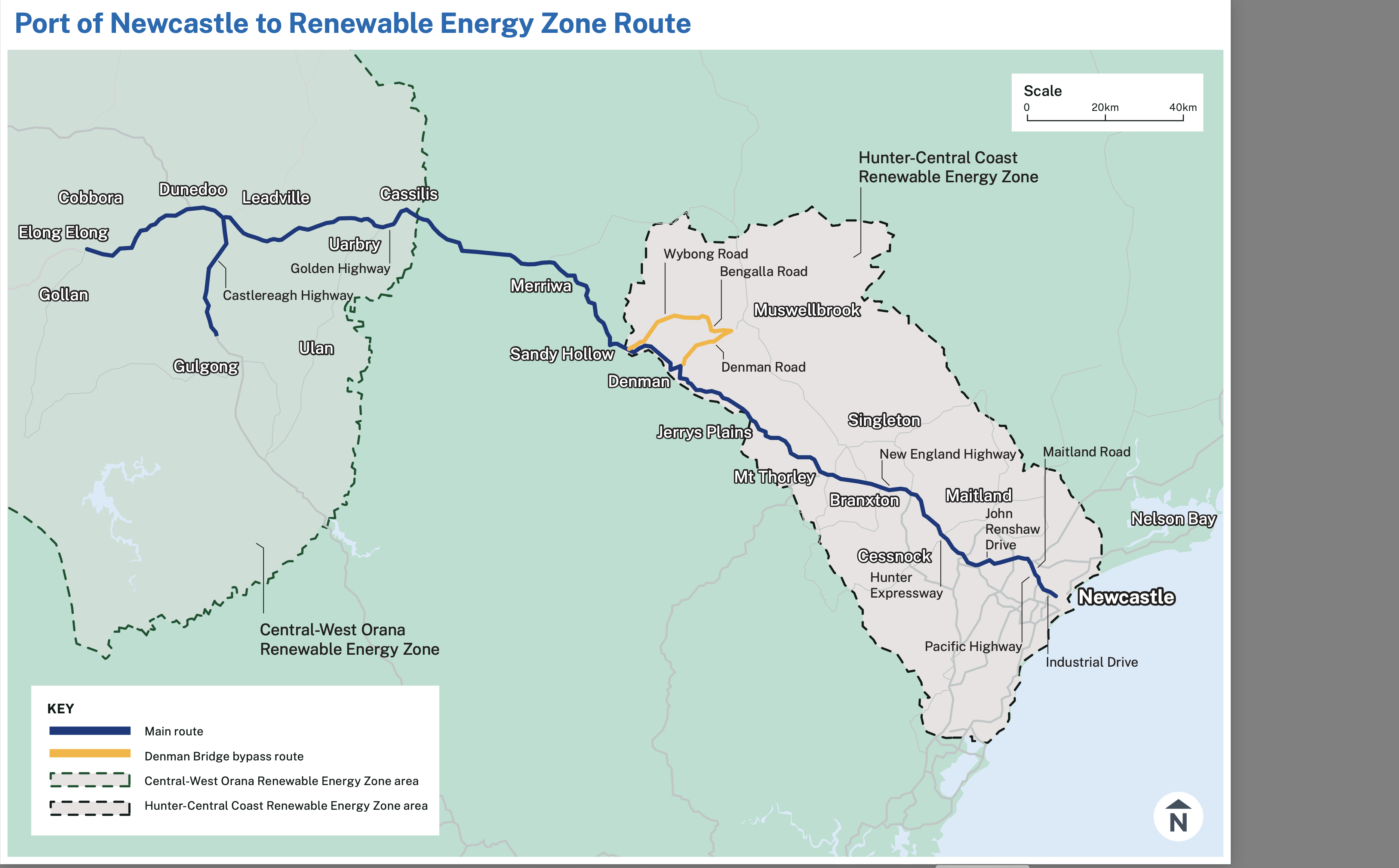 In NSW the State Government in its usual fashion has stepped in to address the issue and perhaps one of the first benefits of the Orana REZ is a coordinated route access from the port of Newcastle to the zone. This requires port, road and a bridge upgrade. However the Denman bridge upgrade is maybe not going to happen. Energyco states: