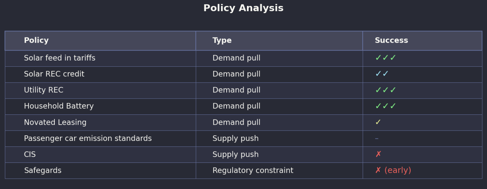 And when I analyse the decarbonisation policies in Australia, or at least those that don’t involve say the CEFC and low cost financing, what I see is that policies I label “demand pull” have been successful.