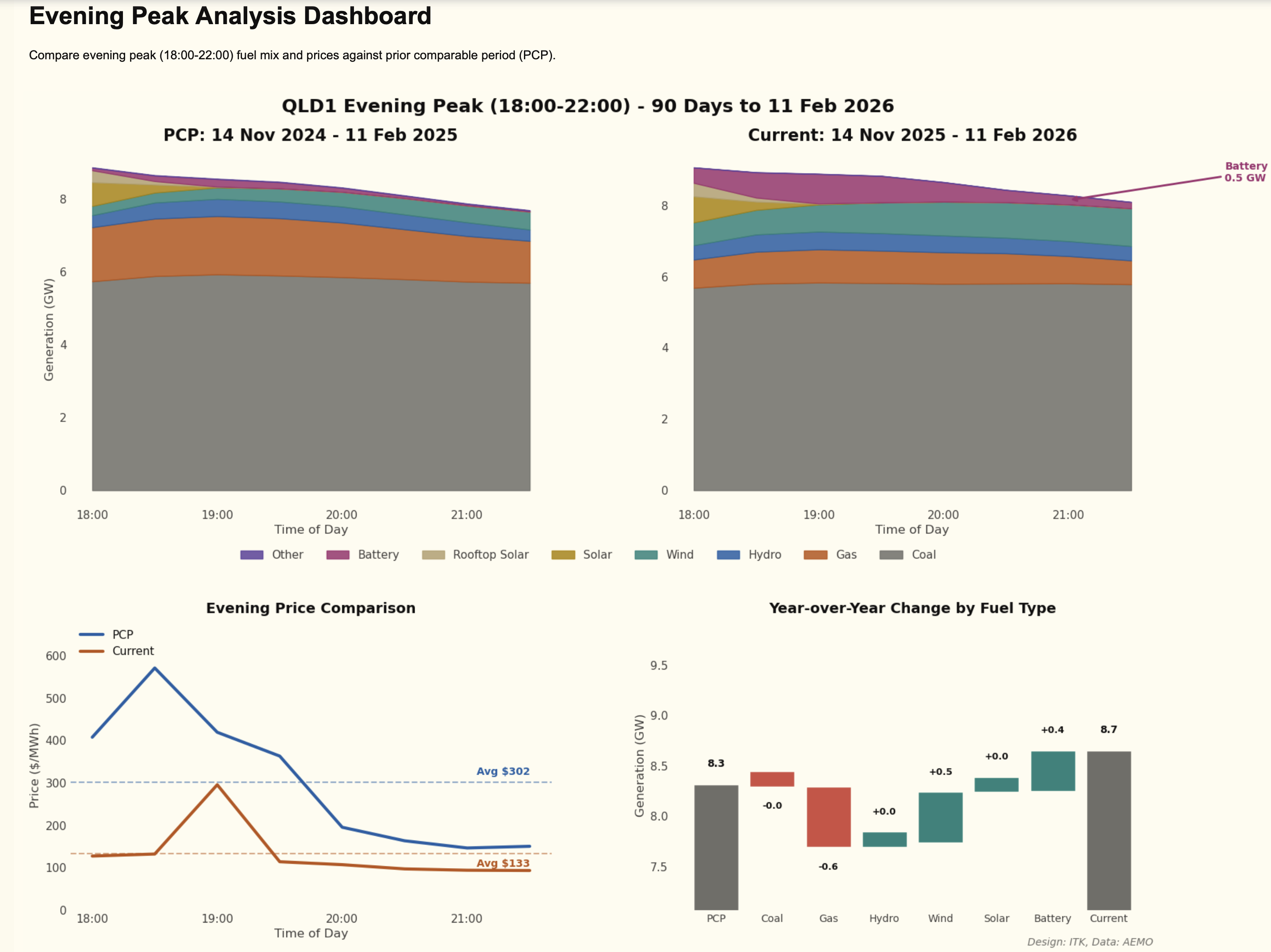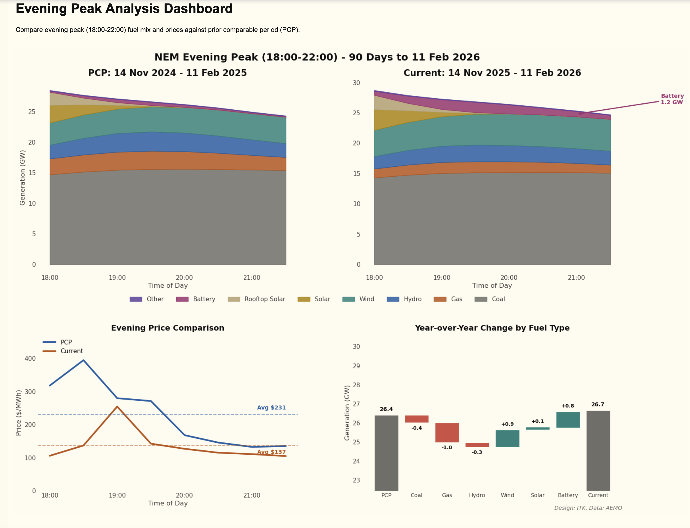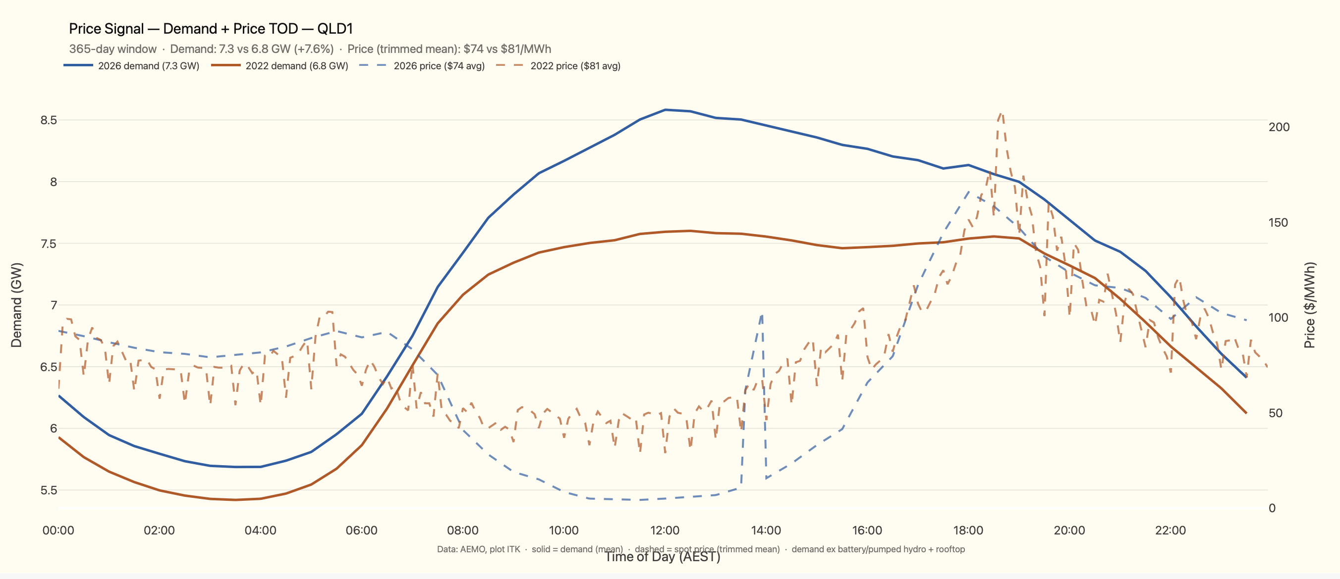 The following plot shows NEM wide demand for the past year compared to the Feb 2022-23 period on a time-of-day basis and the time-of-day, region-share-of-demand-weighted, NEM-wide spot price for both years.