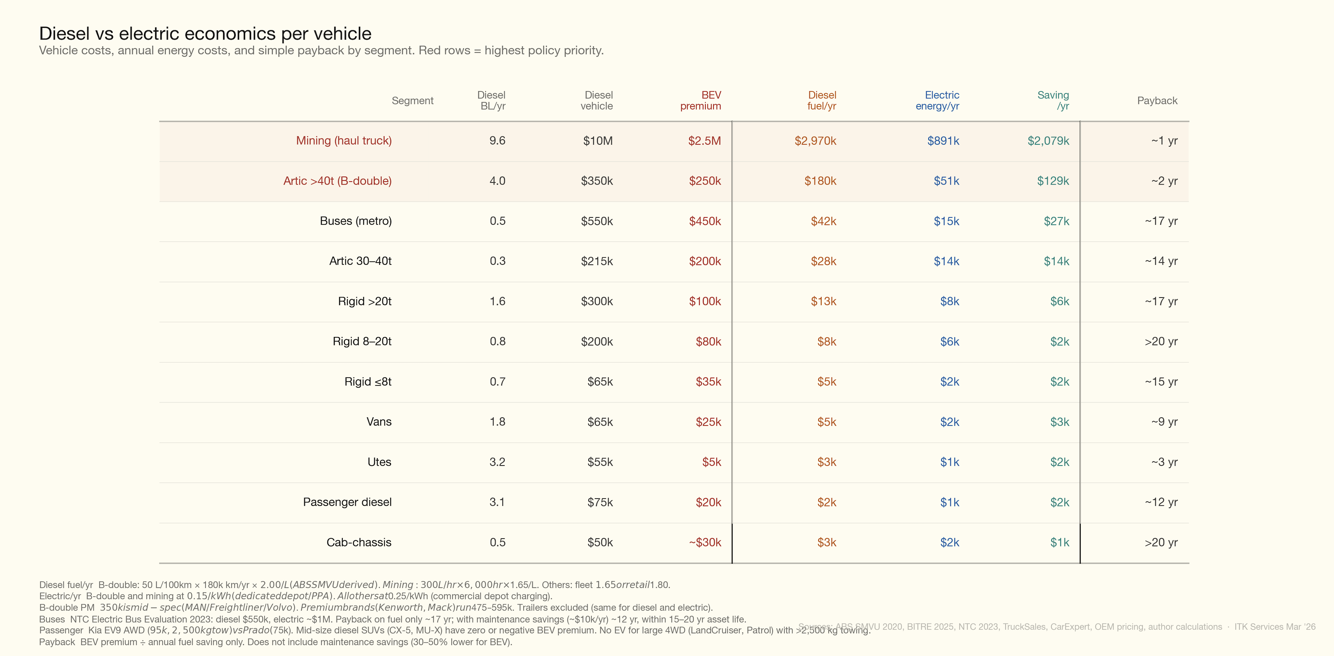 For the industry to act it needs to get a return. For the Government, and considering national security, economics and the size of the target; it wants — or ought to want — to focus on sub-segments where there is lots of diesel consumption. Contrary to what I thought when I started looking at this, the big diesel consumers are mining and long haul trucking. It’s no coincidence that it’s those sectors where fuel consumption per vehicle is high and where therefore electrification potentially offers the largest annual saving to offset against the higher capital cost.