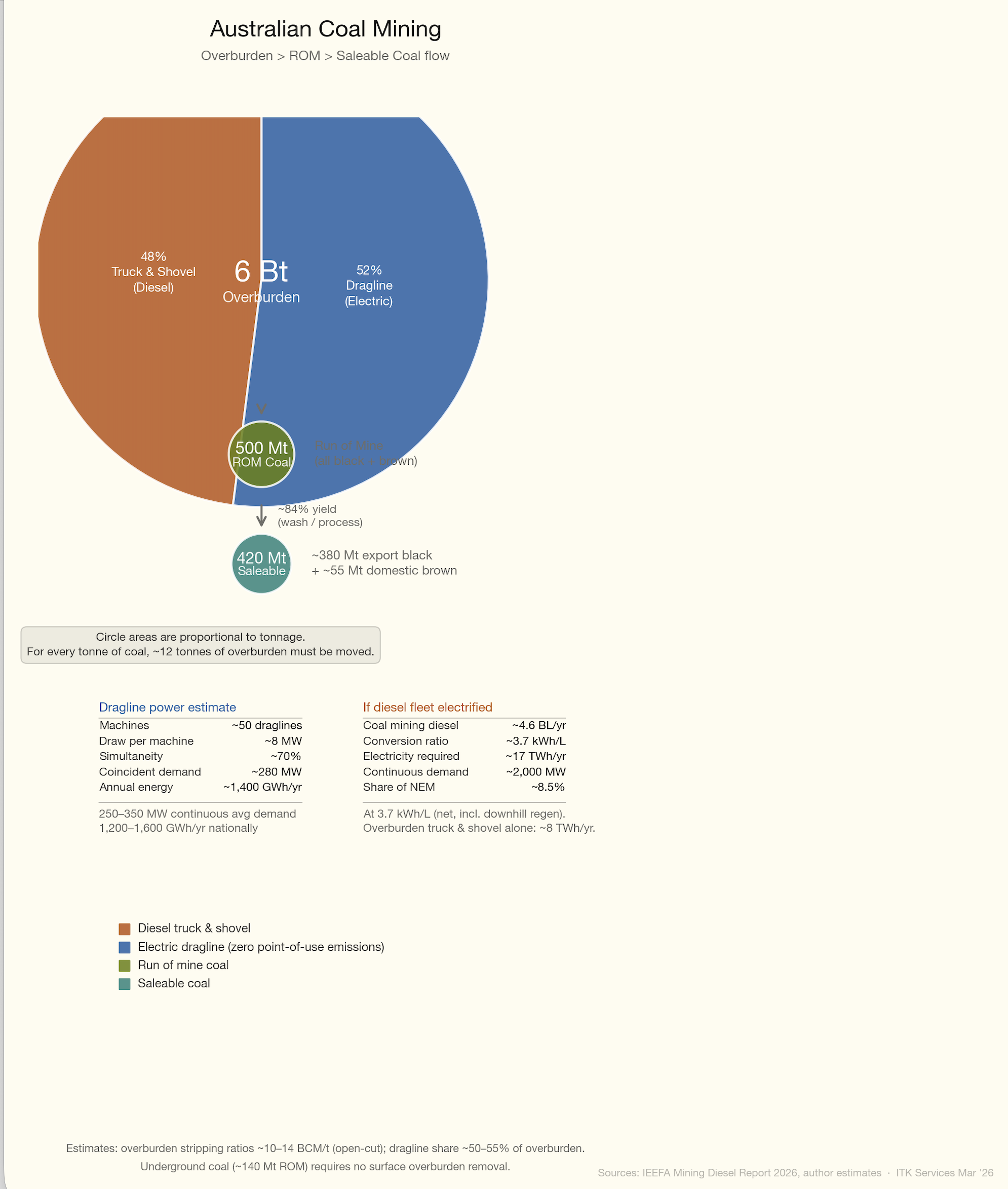 Of the overburden in tonnes a fraction over 50% is moved by maybe 55 large walking draglines. These are electrically powered and the estimate is they consume maybe 200-250 MW of power. The draglines are very efficient, but because it’s getting harder to extract coal in Australia, and as Gorringe points out, we’re getting rid of the draglines and using diesel trucks.