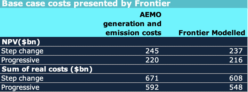 The NPV cost included in the ISP is $122 bn. Frontier’s numbers include operating costs including AEMO’s estimate of carbon costs. From an NPV perspective I have no argument with that. The ISP number is only the capital costs. The basic argument is that avoided fuel and carbon costs will outweigh the capital costs in the NPV analysis.