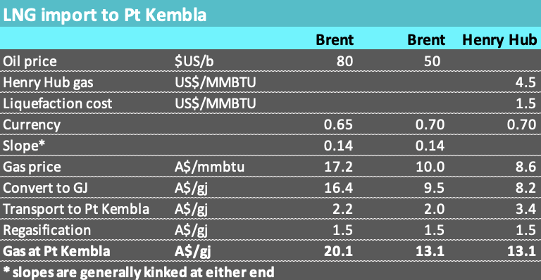 Historically LNG was priced either on a slope to oil, that is the LNG price was some percentage of the oil price with adjustments for both high and low oil prices or it could be priced off the natural gas price in the USA, where the standard is “Henry Hub”. In both cases there needs to be a currency translation transport to Australia and a regasifcation cost allowance. Finally since gas in Australia is on a per gigajoule basis there has to be a conversion from mmbtu to GJ.