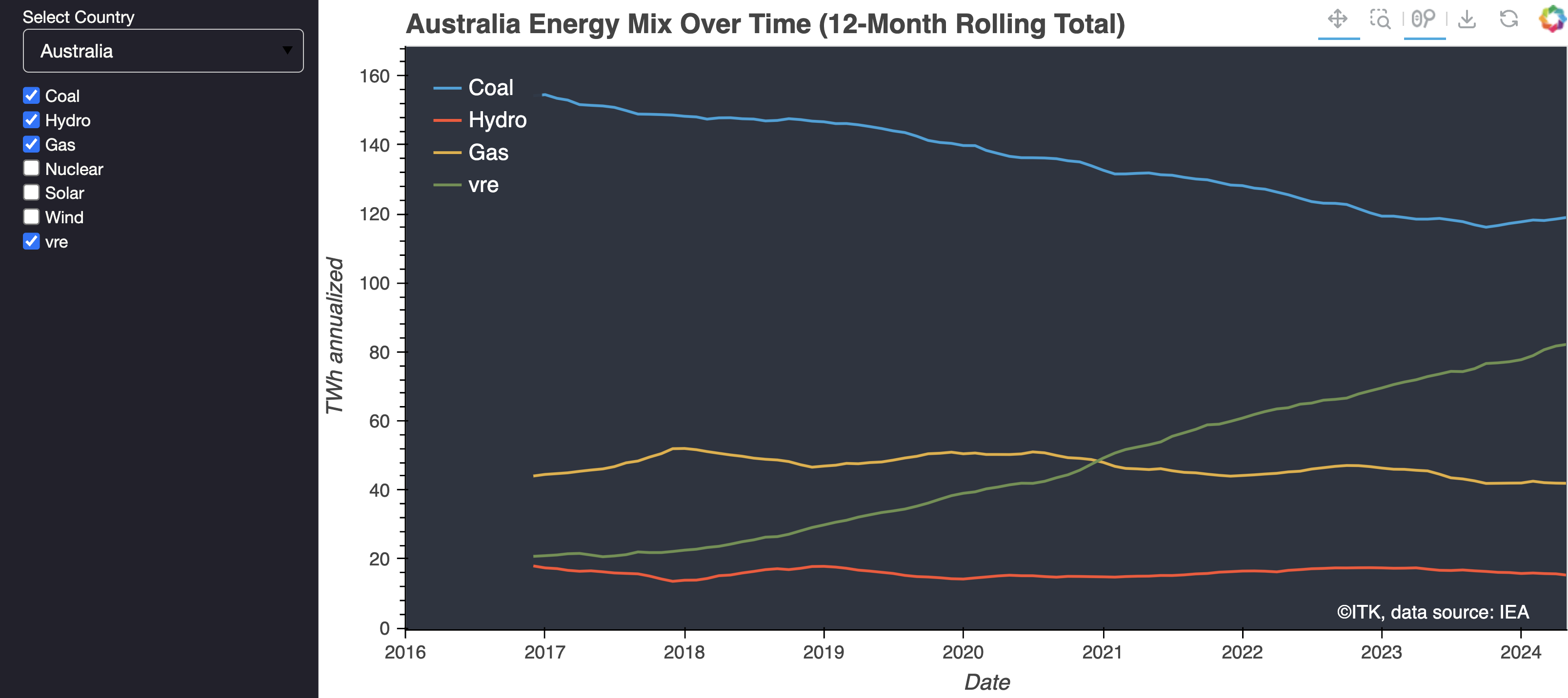 As much as I would like to show the trends here in this document the technology is still not quite there and so we have to head off to ITK website. There you can select the country and the fuel and see 12 month moving average trends of generation by fuel in a graph. A 12 month moving trend has been used to remove seasonal impacts. That comes at the cost of a six month lag as compared to using say a weighted trend. Here is a sample for Australia.