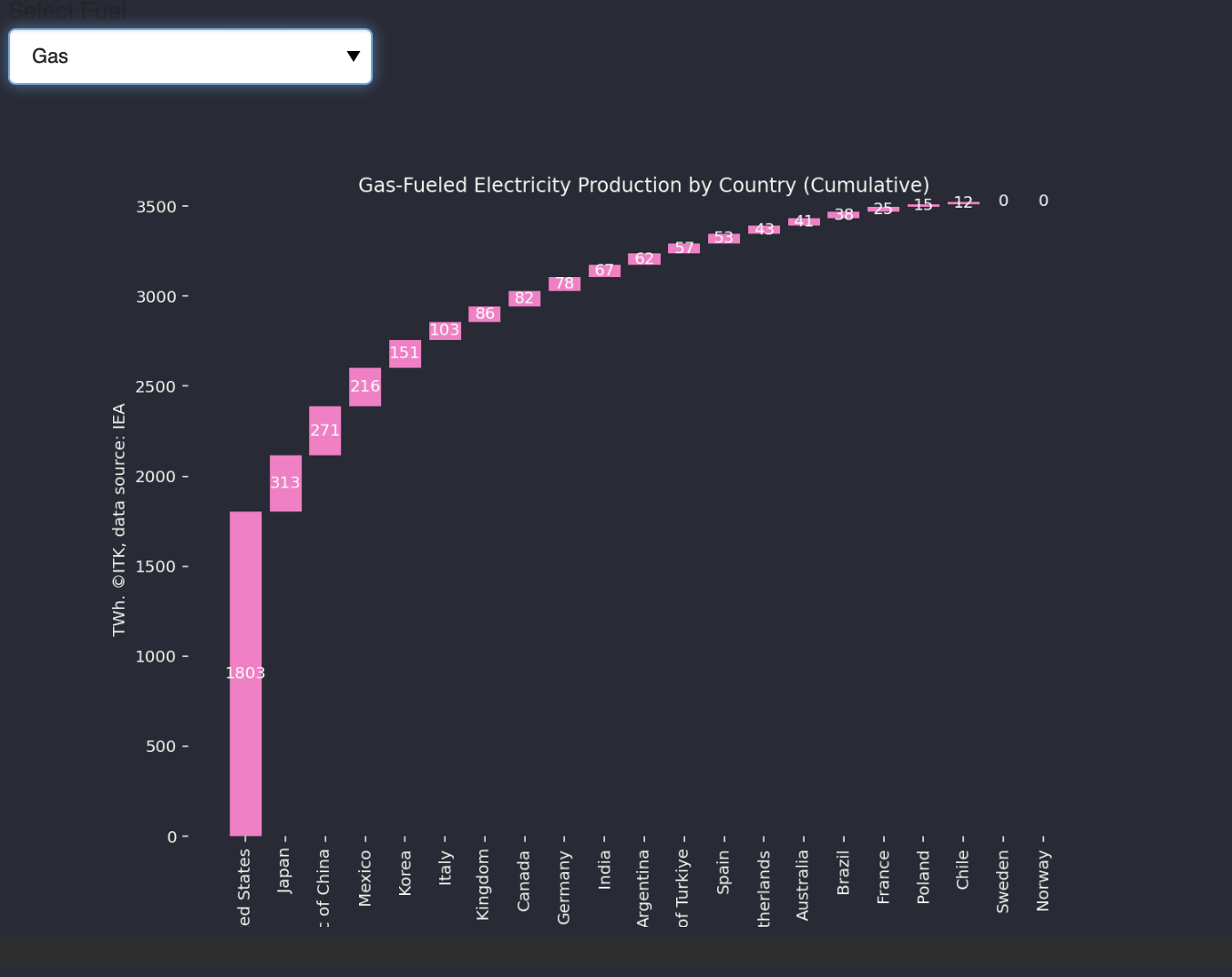 And also from the same data set we can see which countries are using, eg gas, for electricity generation. There’s a menu to choose your fuel and the data is for the 12 months ended May ’24.