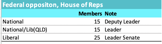 QLD Nationals/Lib and the Nationals are presently the largest force in the Federal Opposition. Most will say this classification is wrong because the Queensland LNP sit in the Liberal partyroom where they notionally could be outvoted. However to an amateur like me it seems that the Nationals and LNP make policy which they then impose on the Liberal Party Room. To the best of my knowledge Dutton is not differentiated from the National Party on any substanial policy issue.