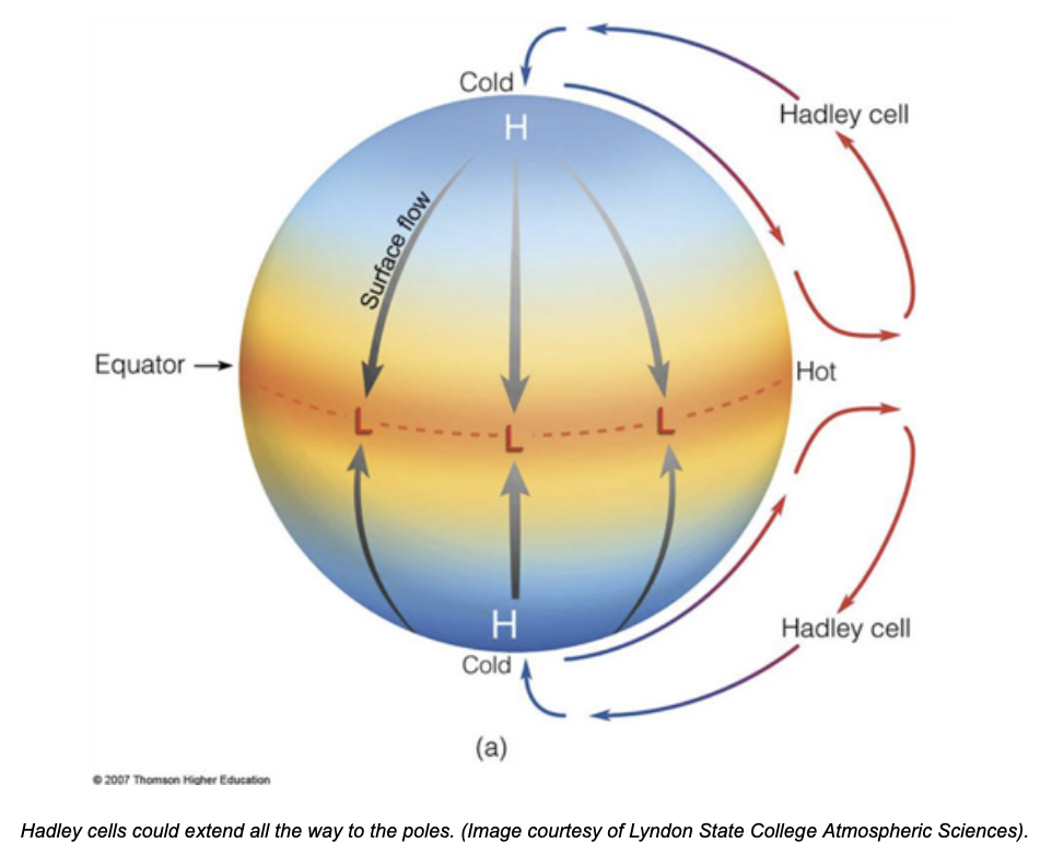 There are also polar cells and “Ferrel cells” in between the polar and Hadley cells.