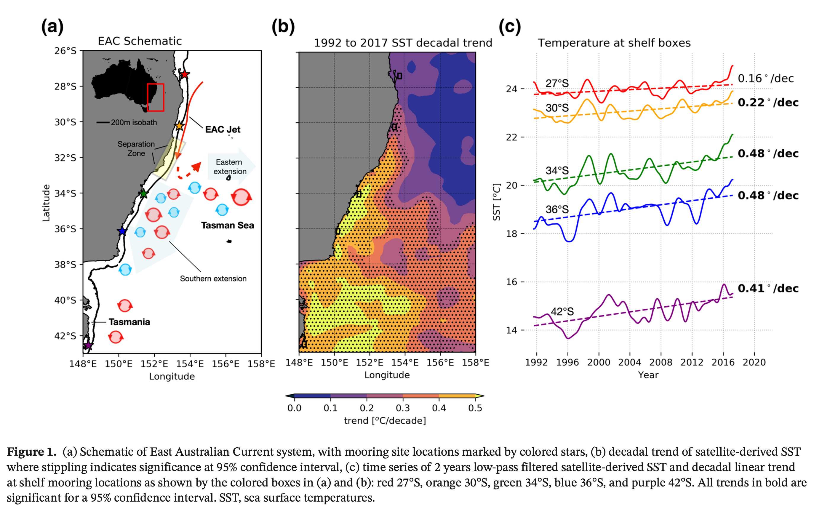 The first point is temperature change. According to the CSIRO the Western Tasman shows a sea surface temperature that is about 1°C warmer than 1980. Some areas along Eastern Australian Shelf are reported to show warming as much as 0.5°C per decade.