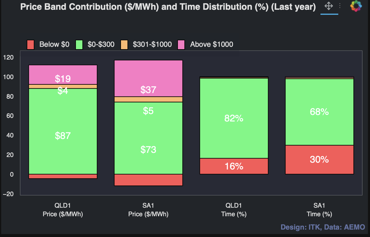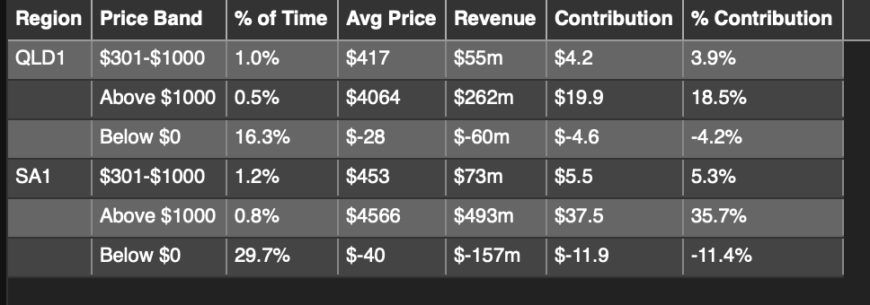 $37/MWh or about 35% of the average South Australian price in the past year was due to periods when prices were over $1000/MWh and a lesser but still meaningful 18% of the QLD average price was due to prices over $1000/MWh