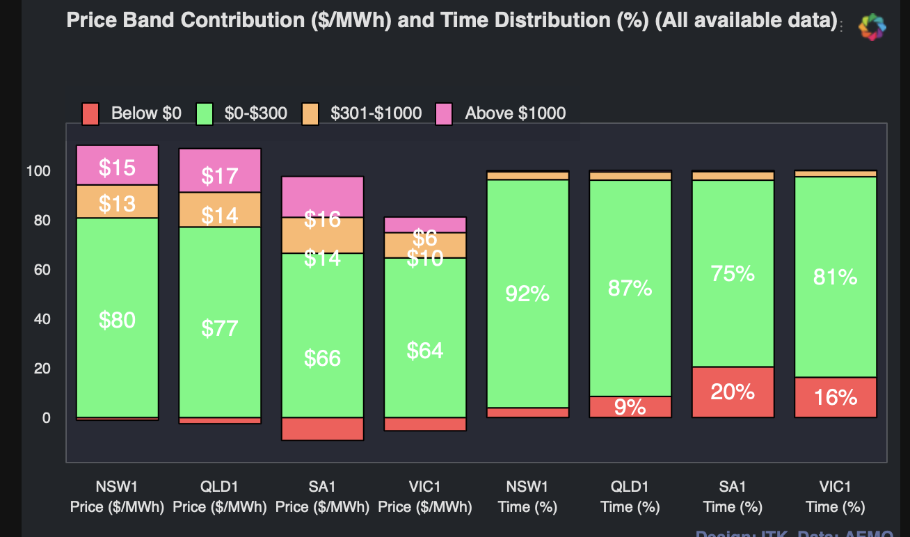 For consumers, particularly as household batteries come along there is an indication that using your household or EV or both battery during those peak periods could be rewarding. $4000/MWh is $4/KWh which for a Tesla power wall with say 5KW of output power you could get $20 for 40 hours or about $800 a year, probably a bit less. The $20 is 5kw x $4/KWh. Equally there are other opportunities for the $100-$300 price band.