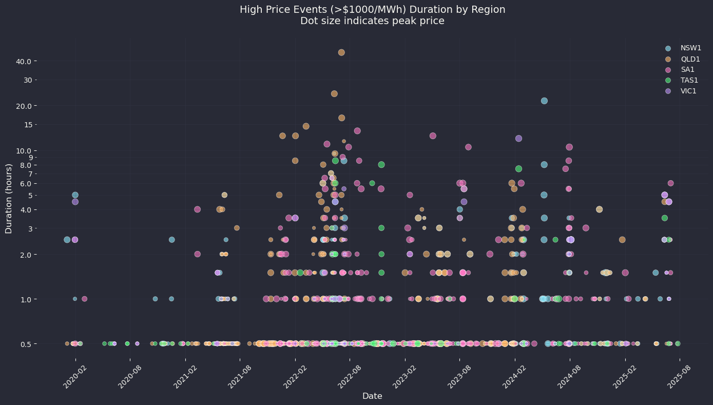 The majority of high-price events were short-lived, with between 52% and 63% lasting less than 30 minutes. On average, these events lasted between 1.1 and 1.5 hours across all regions. Some extreme events did occur: the longest recorded was in QLD, where prices remained above $1000 for 45.5 hours in July 2022. In NSW1, the longest event lasted 21.5 hours in May 2024, reaching prices as high as $16,600.