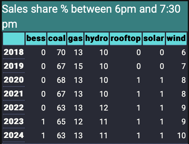 Looking at the 6pm to 7:30 PM window and looking across the whole NEM coal has lost 7% of available pool revenue since 2018 almost entirely to wind. The little bit of solar in the table probably reflects daylight saving effects where QLD doesn’t adopt daylight saving and the NEM runs on QLD time.