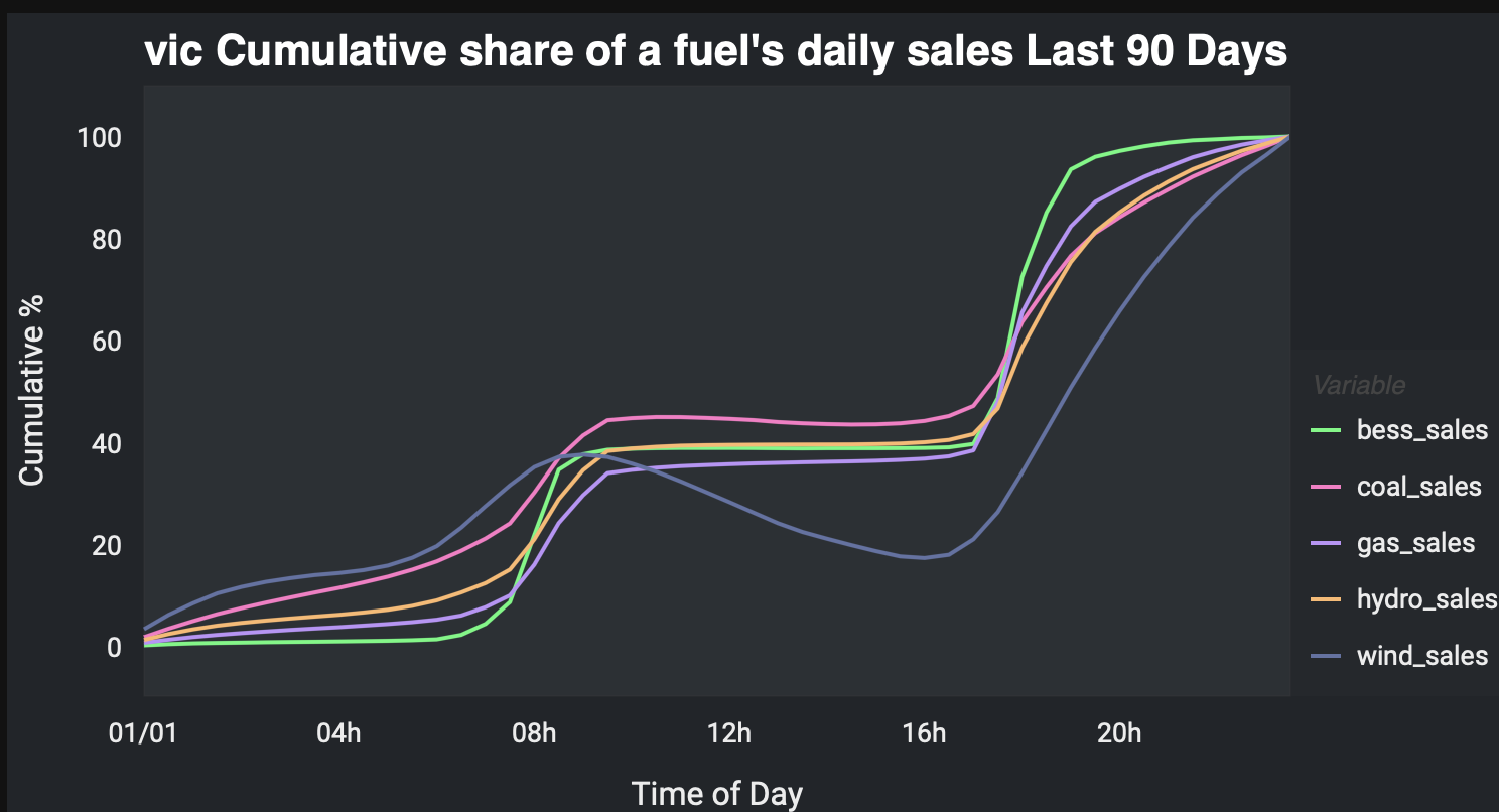 And this is clearer in the cumulative share of sales for a fuel per average day, here for the NEM over the past year ie same data as the prior figure.