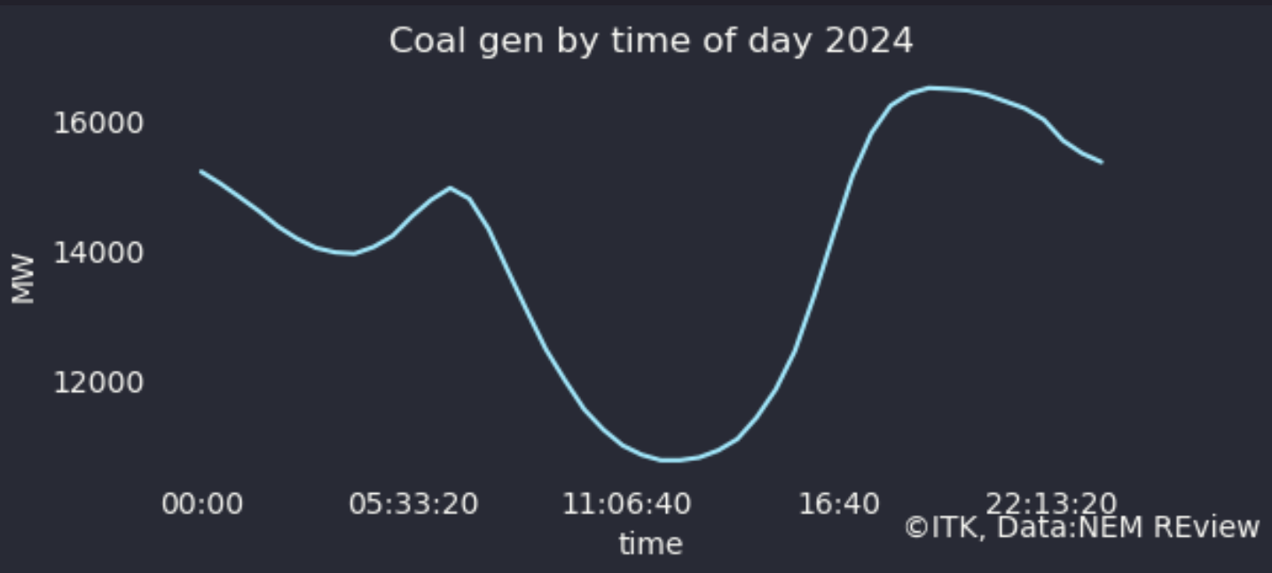 Overall ITK models about 6 GW of battery power to be able to trade morning and evening peaks representing around 25% of demand at that time. Certainly enough to put pressure on prices and therefore sales, partly offset from a coal generator’s point of view by increased charging demand.