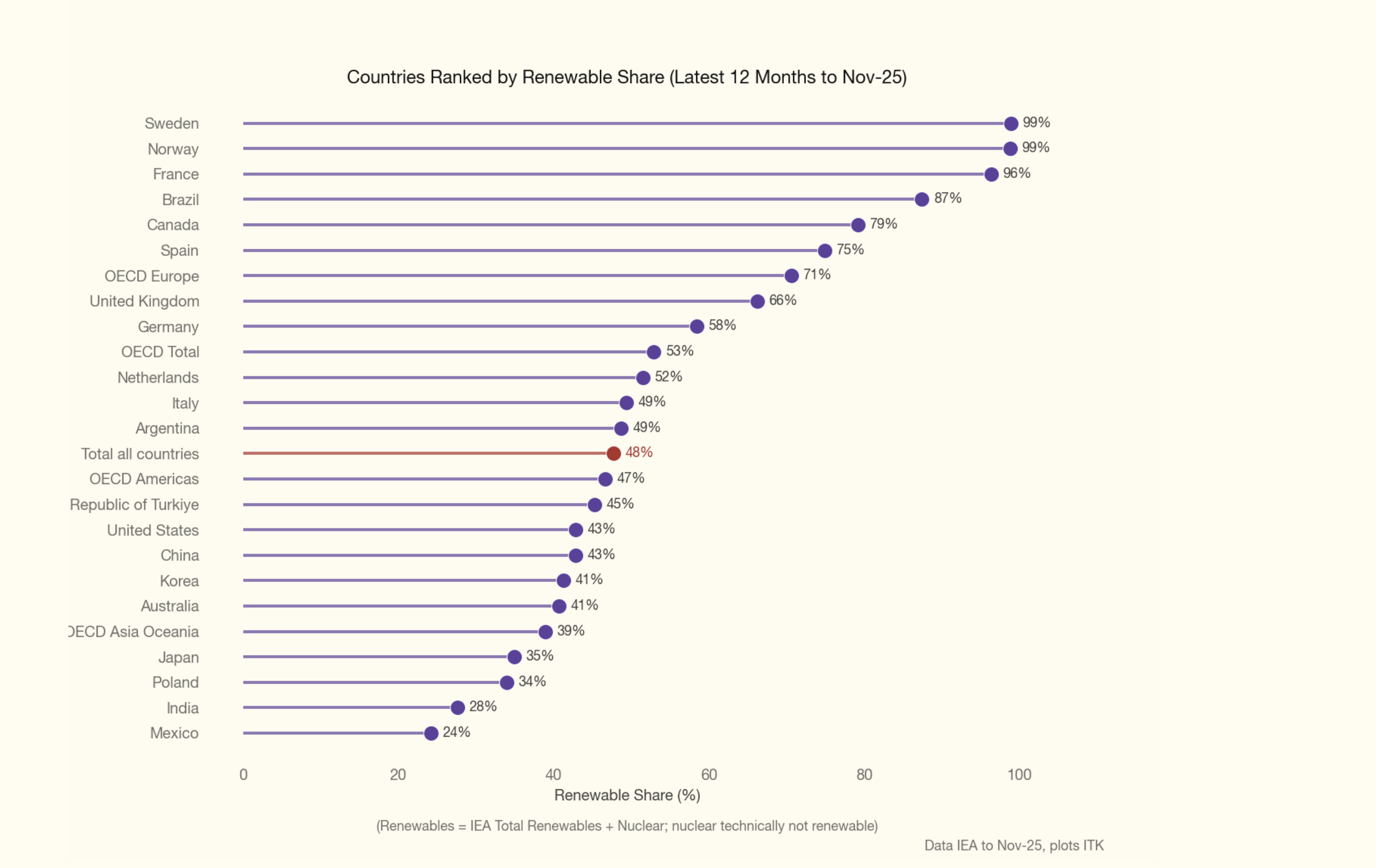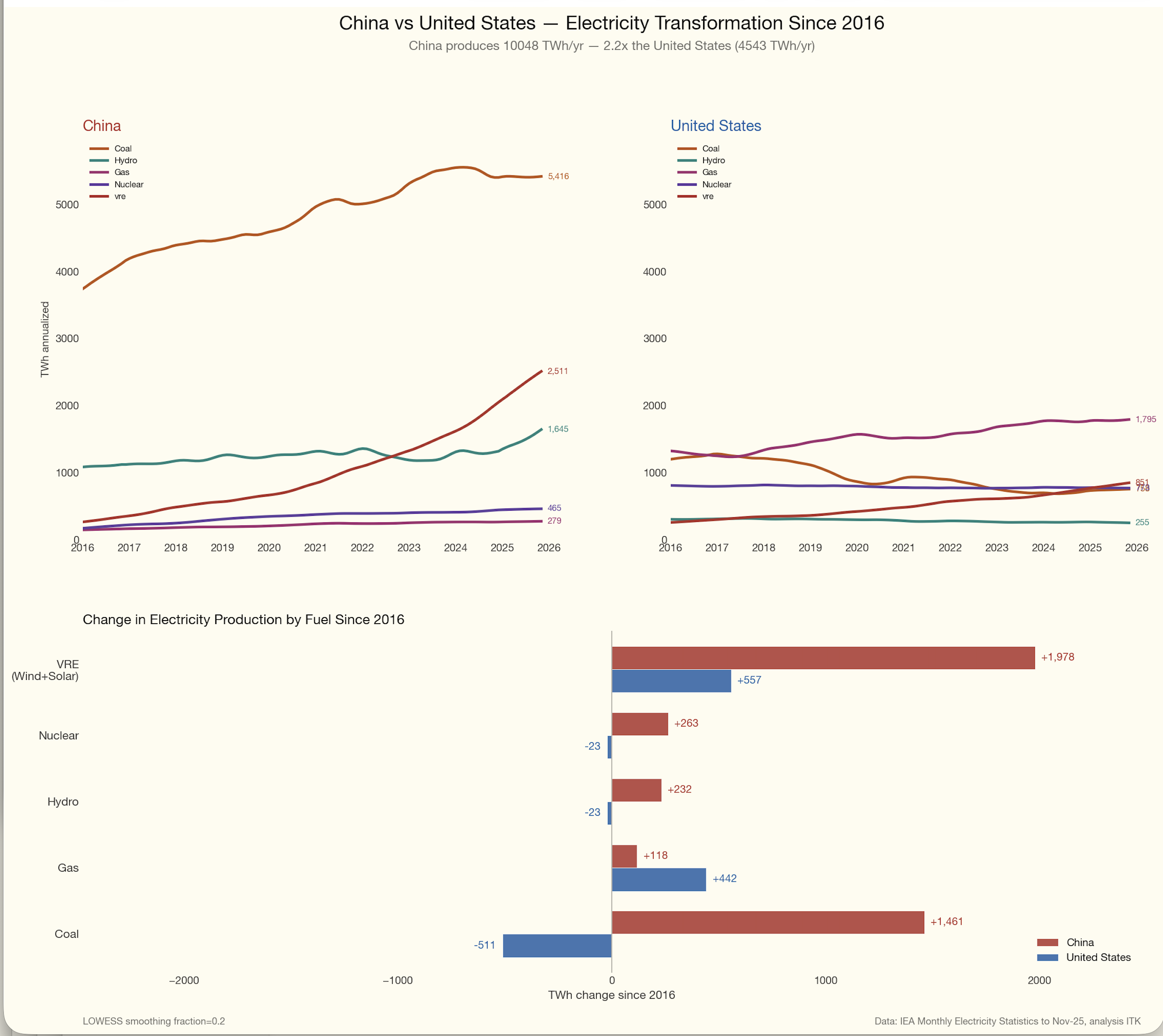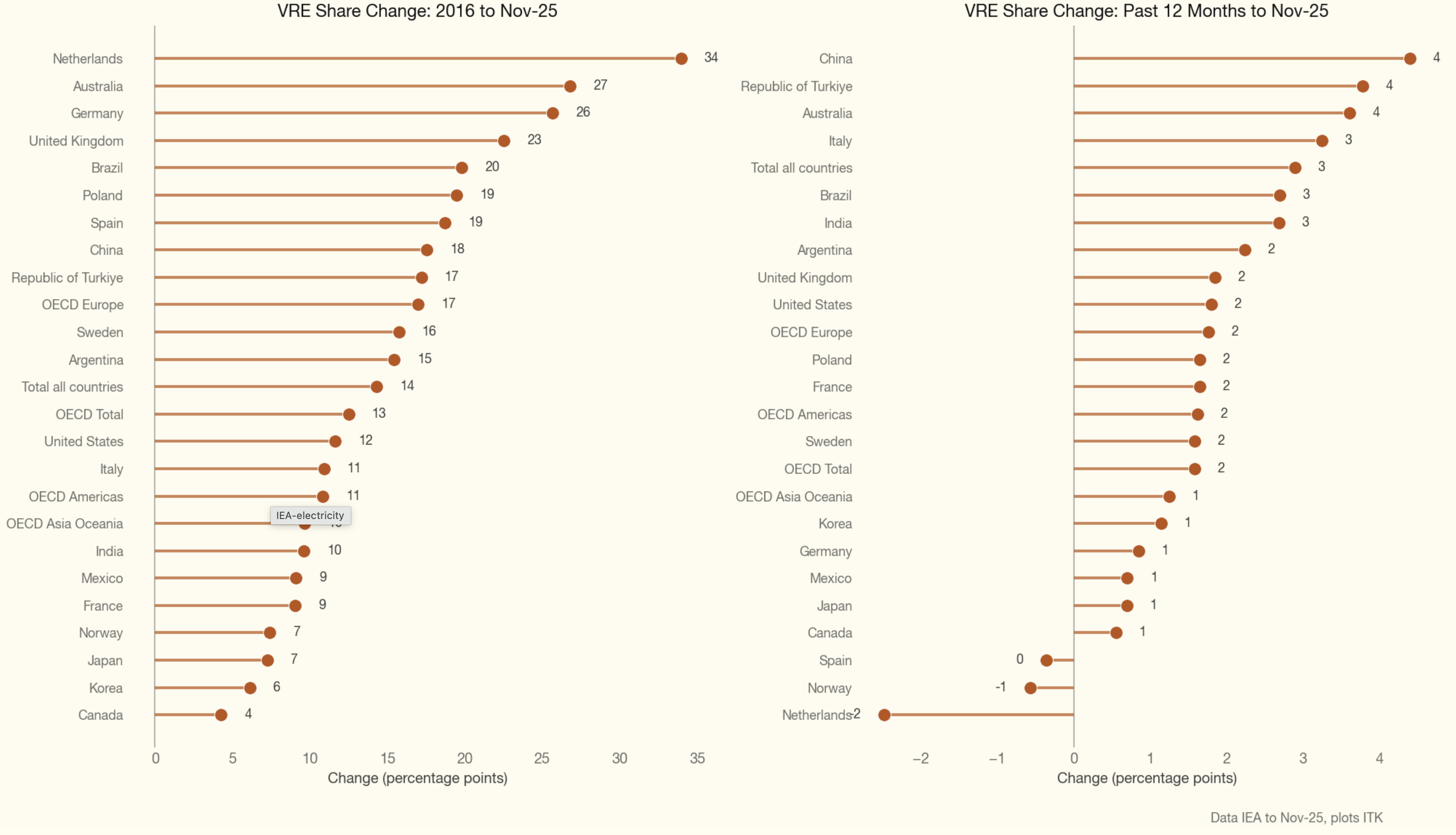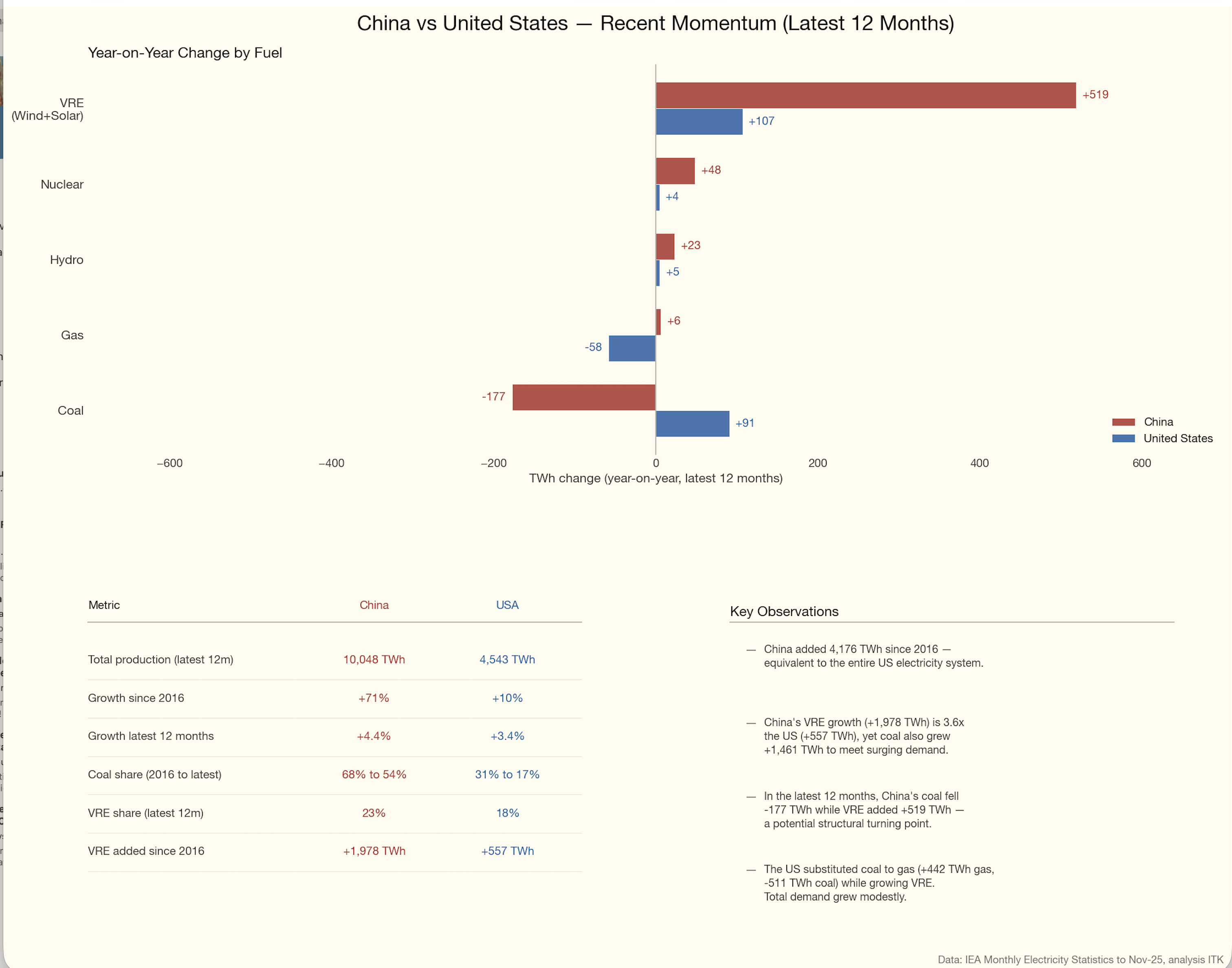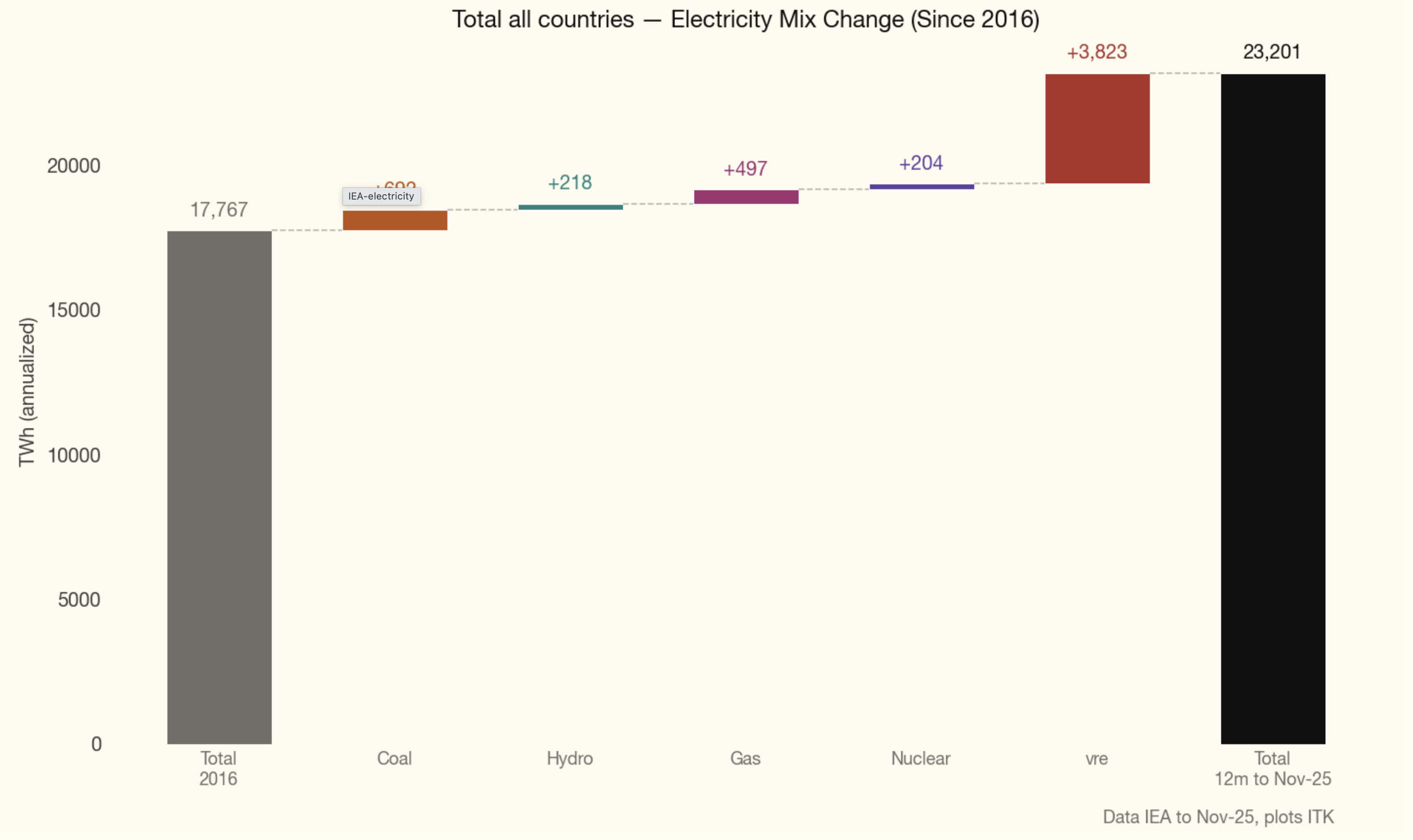 The IEA releases a .csv file of global electricity data every month. It lags a bit due to its comprehensive nature, the latest data runs to November 2025. I maintain a dashboard on my website that updates the data every couple of months and looks at the trends.
