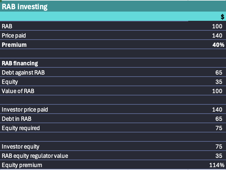 Over many years investors have consistently valued these wires and poles networks at a 20%-40% premium. This premium is expressed in value:rab ratio which is typically around 1.4. But actually in that scenario investors are paying more like 100% premium for the equity as compared to equity value from the regulator’s perspective.