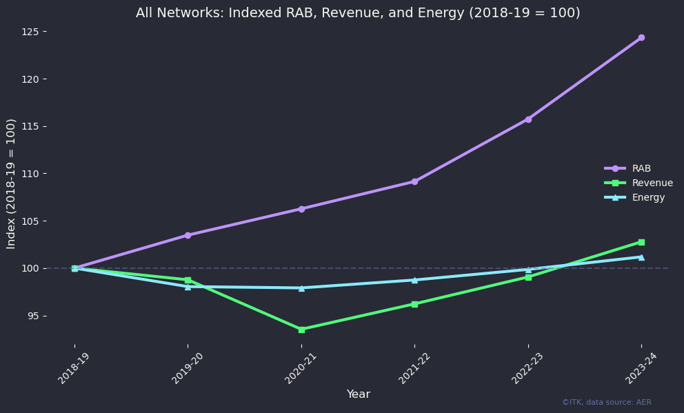 There is a lot of data in the spreadsheets and even a nerd like me cant be bothered with all of it. Still I downloaded spread sheets for 13 network business, for the years FY19 to FY24 and started extracting a few numbers. Despite the AER’s best efforts there is a bit of data cleansing to do. Ausnet has about 4 different names and upper and lower case spelling across its different spreadsheets and years. So when you try to write some Python to read it all in, it isn’t straight forward (That’s code for saying I might have made some mistakes). Use at your own risk and check for yourself.