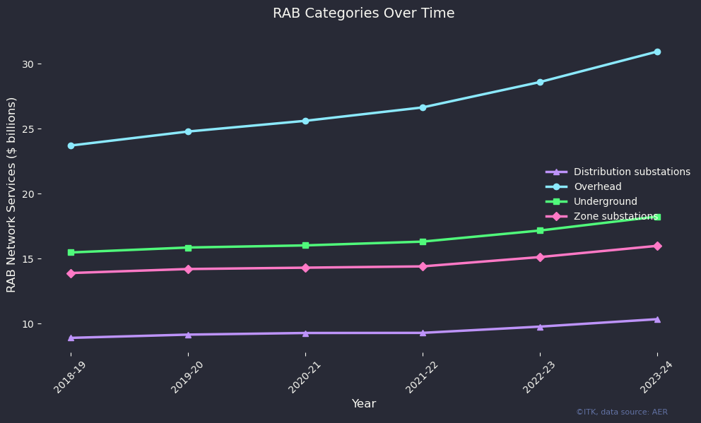I’d have to dig deeper into the data, and it is available, to get the circuit km of overhead lines, but you can get the general picture by looking at the invested dollars by RAB category. The fastest growing category is overhead wires and transformers. There are two observations about this. (1) Voters don’t care about overhead wires and poles when it’s their house and community that ends up being connected. And of course most of this new overhead infrastructure is in regional/rural areas and (2) Overhead wires are much more subject to storm damage and interruptions generally, so the fact that we are still installing more overhead than underground infrastructure does tell you something about economics.