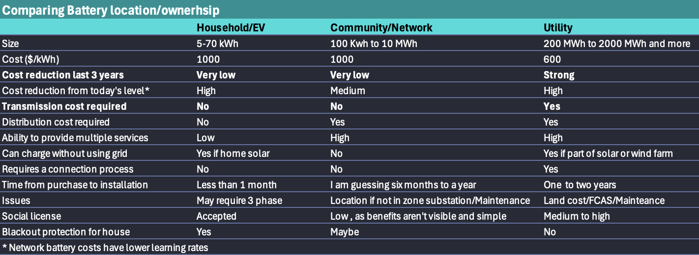 Not making a big deal of it but community/network batteries will depend on network solar imports or buying from the grid to charge. There is a bit less certainty.