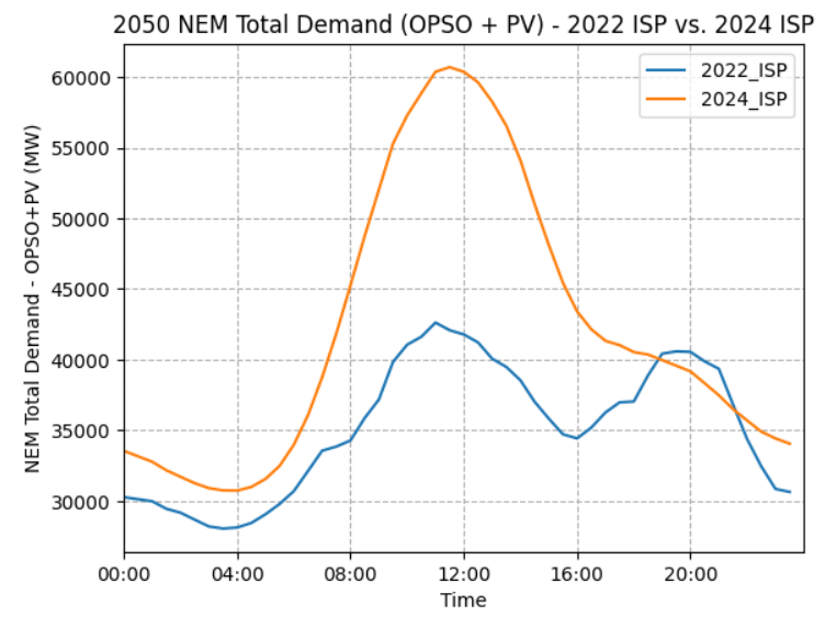 Figure 1 – 2024 ISP demand forecast compared to 2022 forecast by time of day in 2050 (Source: AEMO 2022 ISP and 2024 Draft ISP)