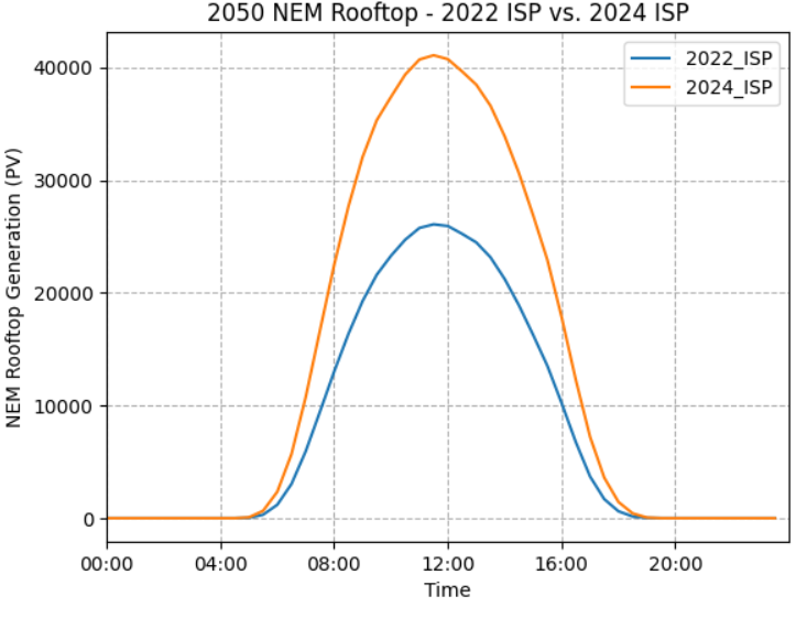 The 2024 ISP generally forecasts higher rooftop PV compared with the 2022 ISP. This gap starts relatively small (around 2023-2025) and significantly widens over time. According to the AEMO 2024 Draft ISP “Consumer Energy Sources are forecasted to be taken up even faster than before, with 18GW more rooftop solar by 2050 under Step Change compared to the 2022 ISP”. Increased EV uptake also significantly bumps daytime total demand, as consumers leverage increased rooftop solar to charge their cars.