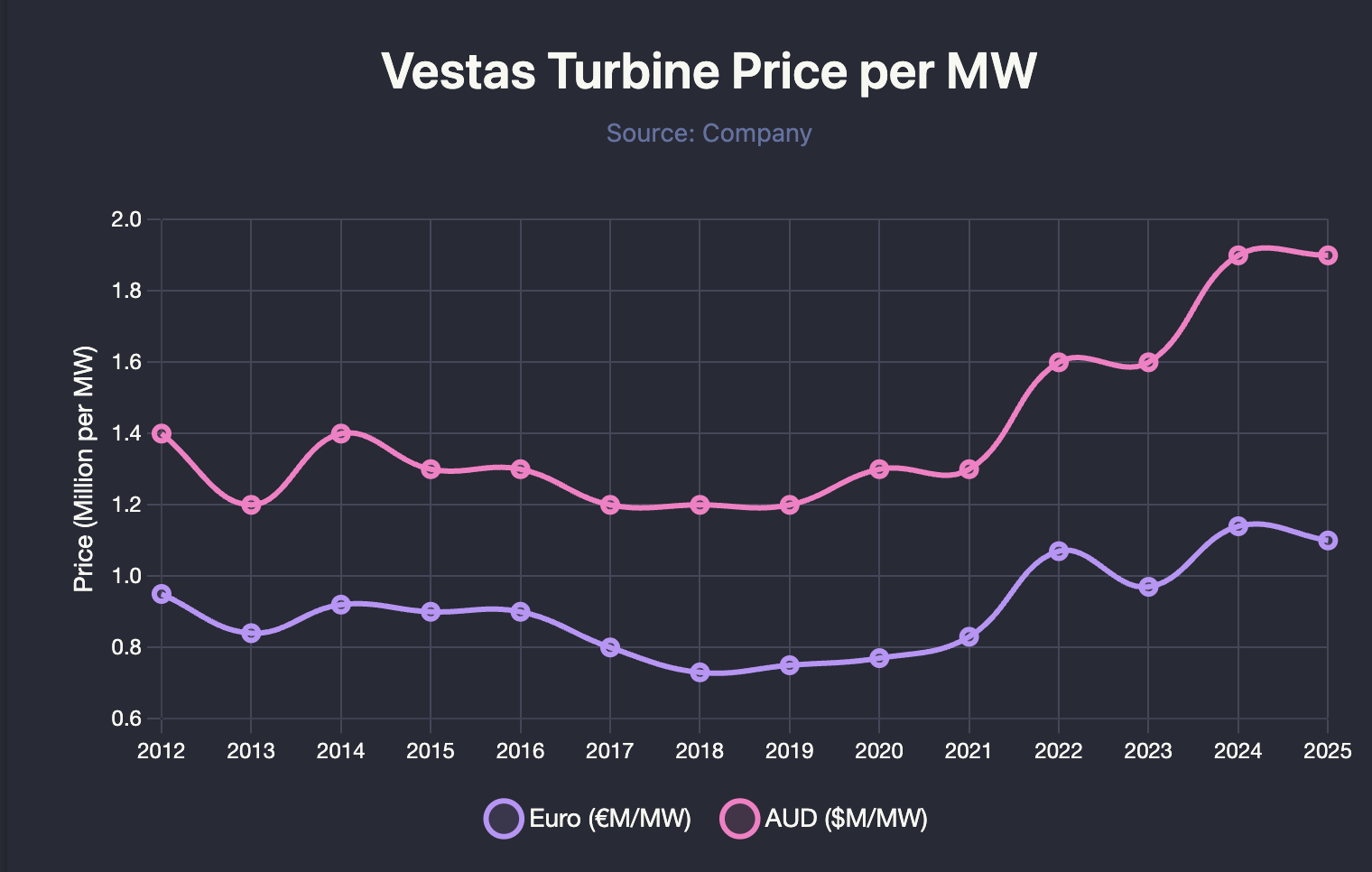 If you are using Vestas, the fall in the AUD-EURO rate has meant that Vestas turbine prices have increased significantly for Australian users.