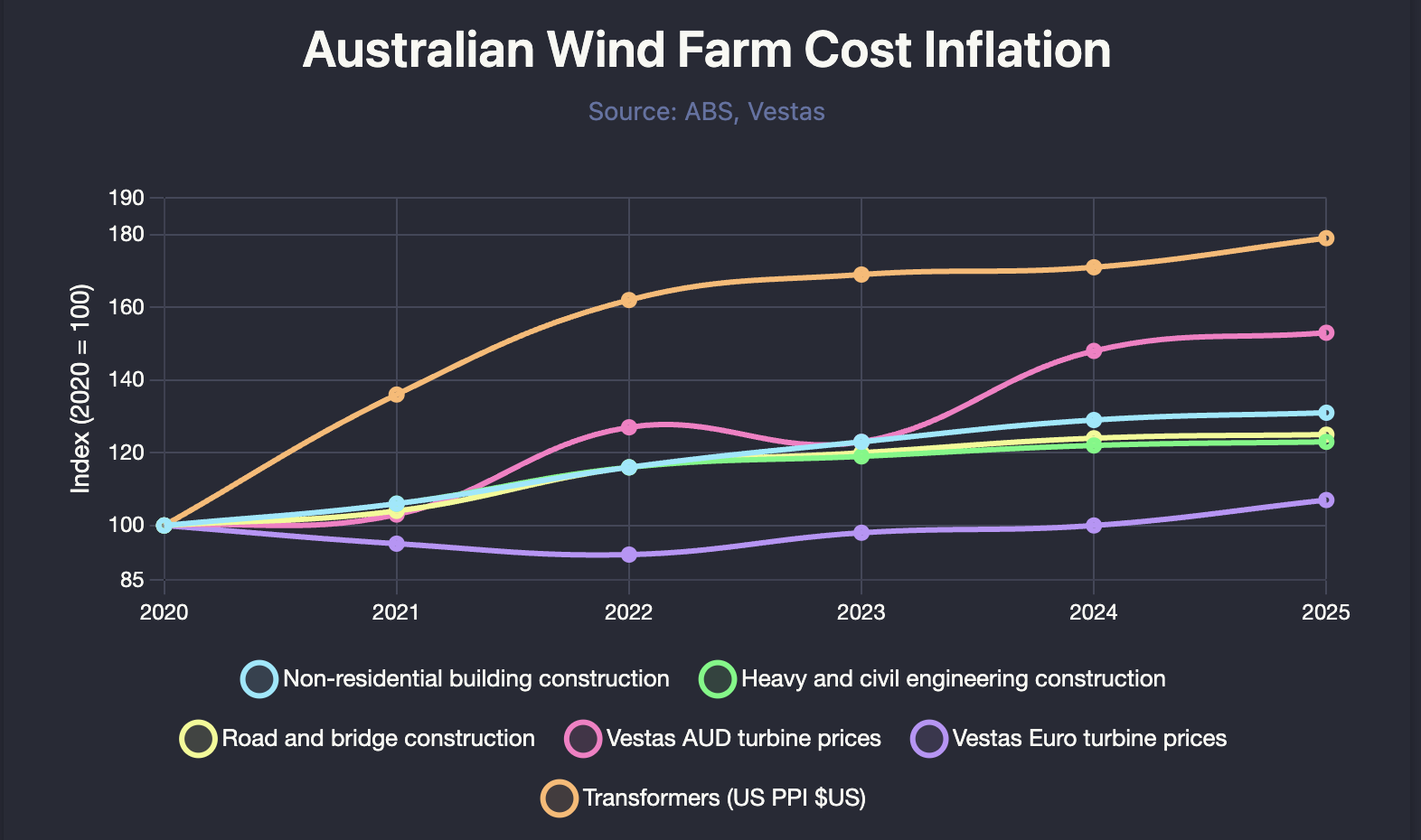 In the following note I’ve converted the PPI and Vestas turbine numbers to an index where December 2020 represents 100. You can see that transformers are the real cost problem, not just in Australia but the USA and, by implication, most places. In A$ transformer inflation would be materially worse. No doubt there are also delays getting transformers.